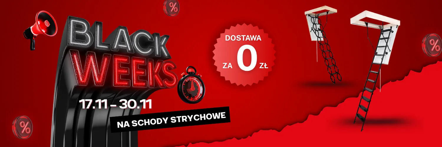 Od 17 do 30 listopada trwa nasz BLACK WEEK – najlepszy moment, by kupić schody strychowe z dostawą za 0 zł! Nie przepłacaj za transport – wybierz idealne schody do swojego domu i zamów bez kosztów dostawy, gdziekolwiek mieszkasz.