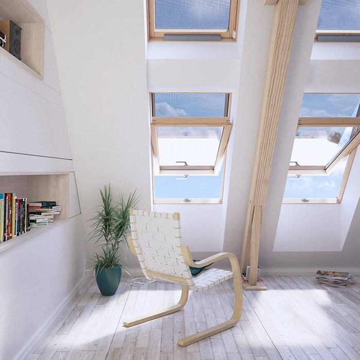 Drewniane, energooszczędne okno dachowe. Zapobiega stratom ciepła. Wyposażone w pakiet trzyszybowy i hartowaną szybę zewnętrzną. Wykonane z drewna sosnowego z certyfikatem FSC, wyróżnia się naturalną, jasną barwą i klasycznym designem. Użytkownicy mają do dyspozycji dwa systemy wentylacji. Klamka z funkcją mikrouchylenia zapewnia dostęp do świeżego powietrza bez ryzyka wychłodzenia wnętrza. Okno z obrotowym systemem otwierania, skrzydło obraca się o 180 stopni, dzięki czemu jest wygodne w obsłudze i łatwe do utrzymania w czystości.