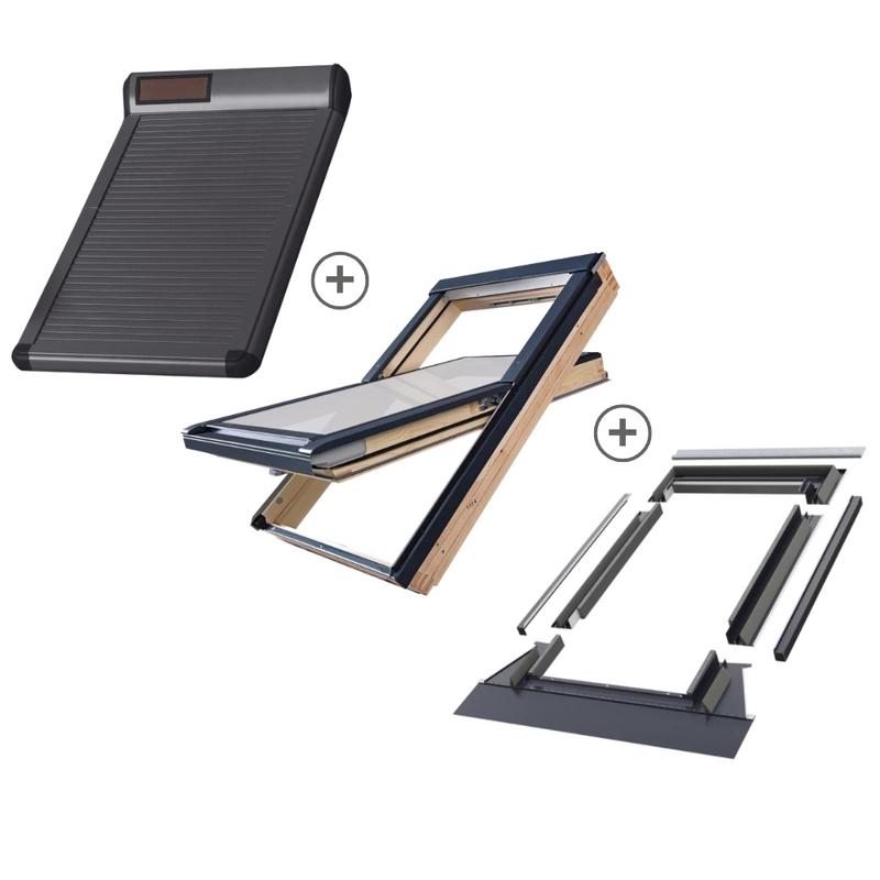 Zestaw okno dachowe FAKRO 3-szybowe drewniane + kołnierz + roleta solarna 78x140