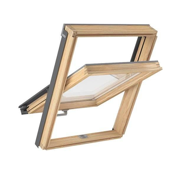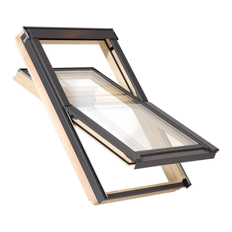 Drewniane okno dachowe z kołnierzem w zestawie. Wyposażone w klamkę z funkcją mikrouchylenia i dwa systemy wentylacji zapewniające możliwość regulacji przepływu świeżego powietrza. Zostało wykonane z wysokiej jakości materiałów, w tym drewna sosnowego i odpornego na działanie warunków atmosferycznych aluminium. Model obrotowy, zawiera pakiet dwuszybowy o współczynniku przenikania ciepła 1,3 W/m2, odpowiedni na poddasza nieogrzewane. Kołnierz TFX przeznaczony jest do montażu okna w dachach o pokryciu falistym.