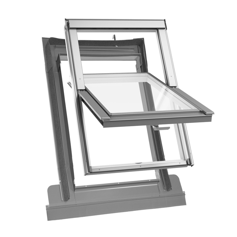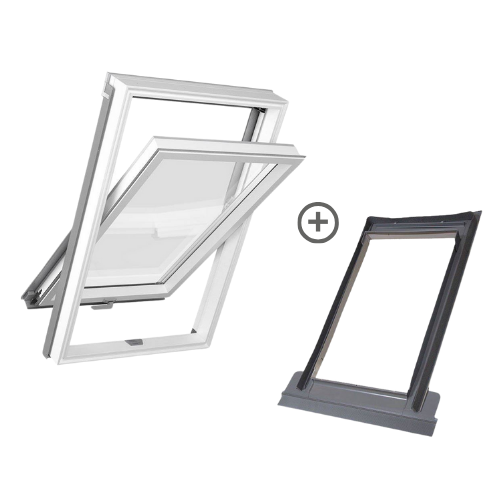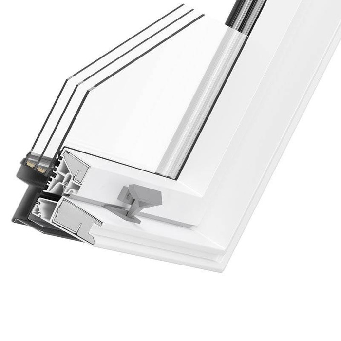 Okno dachowe z PCV z kołnierzem w zestawie. Zawiera energooszczędny pakiet trzyszybowy, ułatwia utrzymanie optymalnej temperatury na poddaszu. Wyróżnia się całkowitą odpornością na wilgoć, jest odpowiednie do kuchni, pralni, łazienki. Skrzydło okienne obraca się o 180 stopni, można zablokować je w wygodnej pozycji do mycia. Funkcja mikrouchylenia zapewnia dostęp do świeżego powietrza bez ryzyka wychłodzenia wnętrza. Dołączony do zestawu kołnierz TFX pozwala na szczelne połączenie okna z falistym pokryciem dachowym.