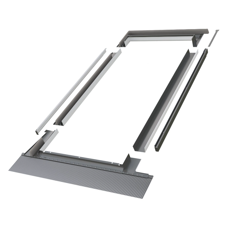 Moduł KZV-1-P umożliwia szczelne połączenie okien dachowych w grupy pionowe, poziome, blokowe z pokryciem profilowanym o wysokości profilu do 45mm takich jak dachówki ceramiczne, betonowe, blachy trapezowe, blachodachówki.