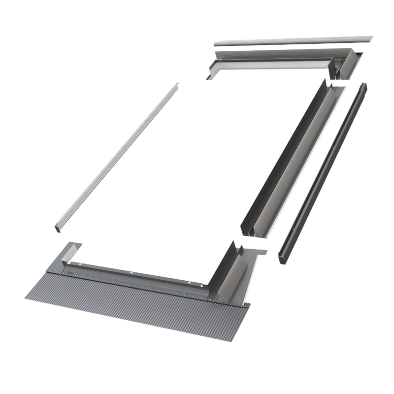 Moduł KZV-3-P umożliwia szczelne połączenie okien dachowych w grupy pionowe, poziome, blokowe z pokryciem profilowanym o wysokości profilu do 45mm takich jak dachówki ceramiczne, betonowe, blachy trapezowe, blachodachówki.