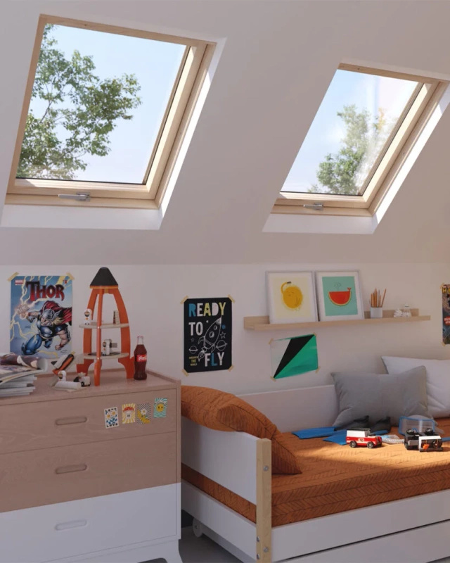 Energooszczędne okno dachowe z pakietem trzyszybowym. Współczynnik przenikania ciepła 1,1 W/m2K zapewnia doskonałe parametry termoizolacyjne, ułatwia utrzymanie optymalnej temperatury na poddaszu i zmniejsza koszty jego ogrzewania. Okno Rooflite+ Trio Pine zostało wykonane z impregnowanego drewna sosnowego z certyfikatem FSC. Profile wewnętrzne mają naturalny, drewniany kolor, oblachowanie zewnętrzne jest szare (RAL 7043). Zawiera klamkę z funkcją mikrowentylacji w dolnej części skrzydła.