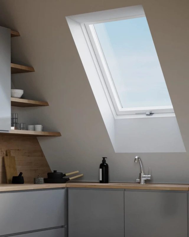 Obrotowe okno dachowe o podwyższonej odporności na wilgoć. Zostało wykonane z białych profili PVC, jest solidne i łatwe do utrzymania w czystości. Klamka z funkcją mikrowentylacji zapewnia cyrkulację świeżego powietrza bez konieczności otwierania okna. Pakiet dwuszybowy wzbogacono dwiema powłokami niskoemisyjnymi zapobiegającymi stratom ciepła. Zewnętrzna szyba jest hartowana, odporna na rozbicie i obciążenia wiatrem. Oblachowanie zewnętrzne w kolorze szarym (RAL 7043) doskonale komponuje się z nowoczesnymi projektami dachów.