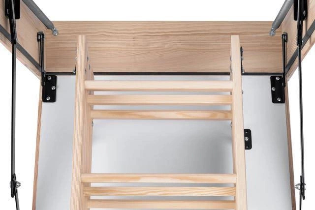 Schody strychowe Komfort to doskonałe rozwiązanie dla osób, którym zależy na wygodnym i bezpiecznym wejściu na strych. Zostały wyposażone w solidną, metalową poręcz i antypoślizgowe stopki. Przeznaczone są do montażu na poddaszu ocieplonym, który nie wymaga dodatkowej termoizolacji. Posiadają współczynnik przenikania ciepła na poziomie 1.1 W/m2K. Konstrukcja z naturalnego drewna wyróżnia się dużą odpornością na uszkodzenia i eleganckim wykończeniem. Klapa zawiera pojedyncze uszczelnienie i opatentowany zamek samozatrzaskowy. Schody Komfort są odpowiednie do kondygnacji o wysokości 280 cm.