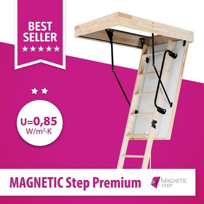 Schody strychowe Magnetic Neo Step Premium charakteryzują się niskim współczynnikiem przenikania ciepła, który utrzymuje się na poziomie 0,85 W/m2K. Zapobiegają powstawaniu mostków termicznych i zwiększają efektywność energetyczną budynku. Zostały wyposażone w 3-segmentową drabinkę z naturalnego drewna oraz białą, ocieplaną klapę. Do zestawu dołączono drążek do otwierania, metalową poręcz i antypoślizgowe stopki. Schody Step Premium przeznaczone są do kondygnacji o wysokości 280 cm, zapewniają bezpieczne i wygodne wejście na poddasze.