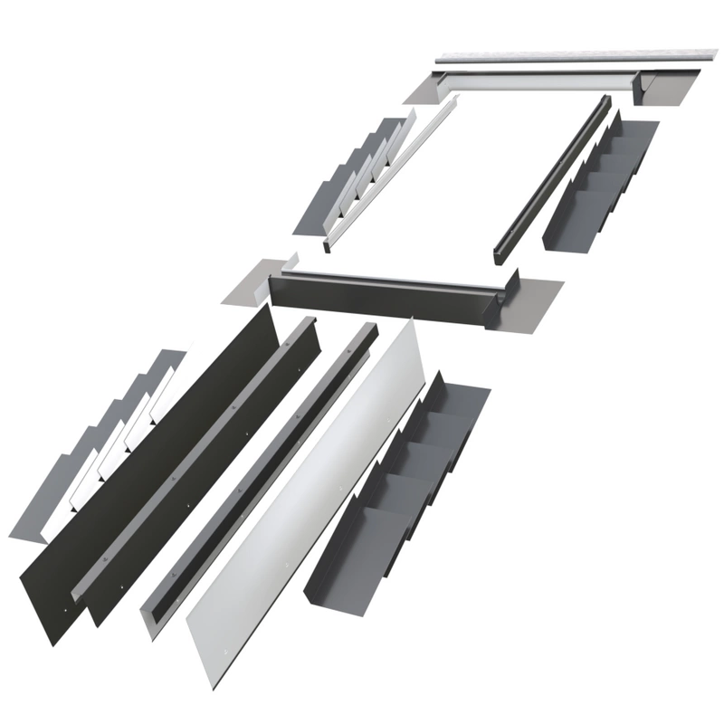 Kołnierz EUV-L/B przeznaczony do okien kolankowych B. Umożliwiają szczelne połączenie okna dachowego dowolnej konstrukcji montowanego w połaci dachu z oknem kolankowym osadzonym w ścianie pionowej. Służy do montażu okna w pokryciu łuskowym ( 2 warstwy po 5 mm).
