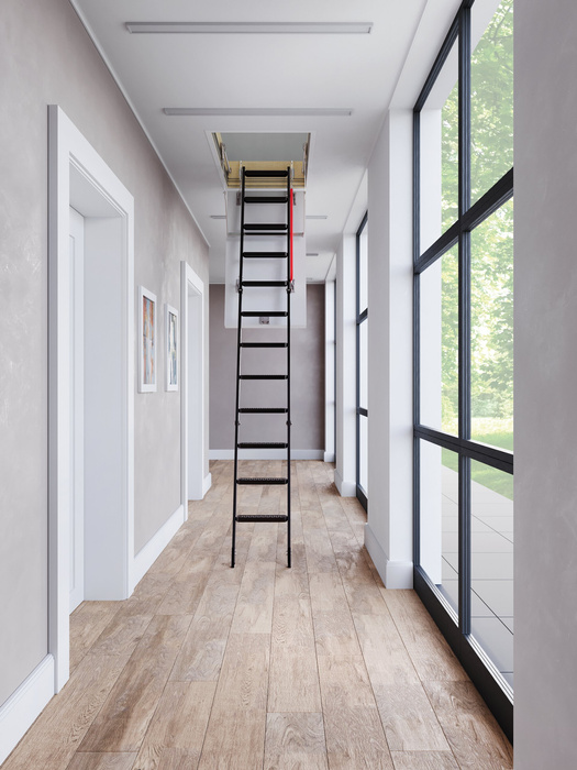 - Stopnie antypoślizgowe oraz znaczne odsunięcie drabinki od klapy schodów dodatkowo ułatwiają poruszanie się po nich.