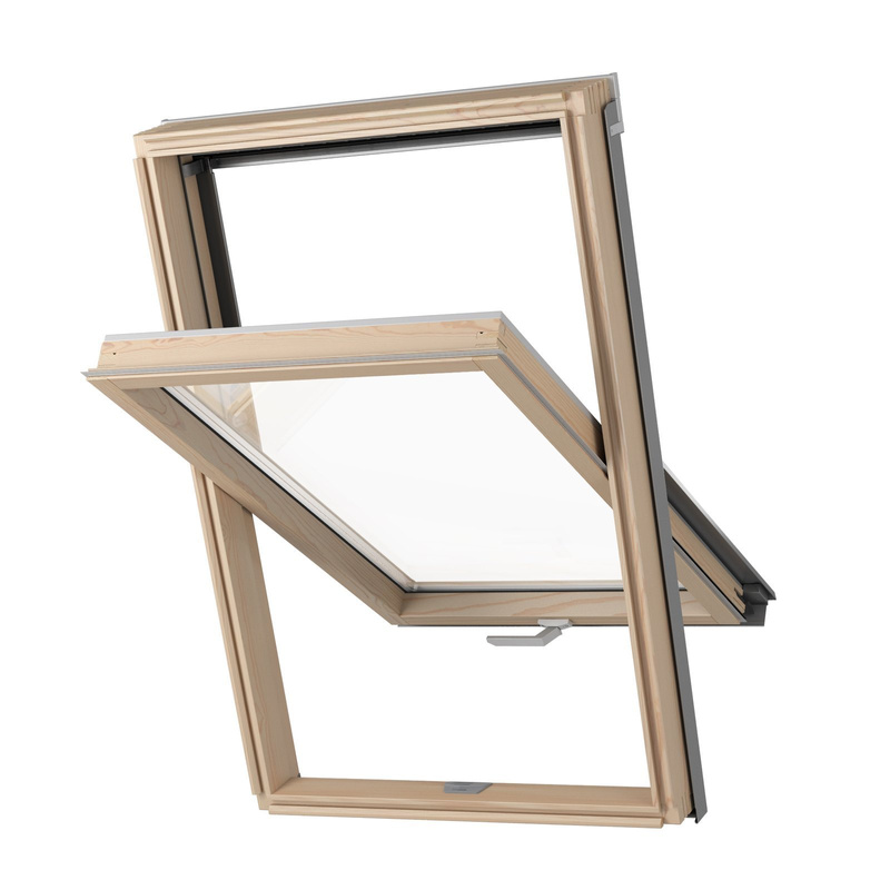 Okno dachowe z pakietem dwuszybowym. Wyposażone w solidną ościeżnicę i hartowaną szybę zewnętrzną. Wyróżnia się dużą odpornością na uszkodzenia, zostało wykonane z certyfikowanego drewna sosnowego i ciemnoszarej blachy aluminiowej. Sprawdza się w trudnych warunkach atmosferycznych. Funkcja mikrouchylenia i dwa systemy wentylacji zapewniają możliwość regulacji przepływu świeżego powietrza. Oś obrotu umieszczona w połowie wysokości skrzydła. Produkt objęty jest dziesięcioletnią gwarancją producenta.