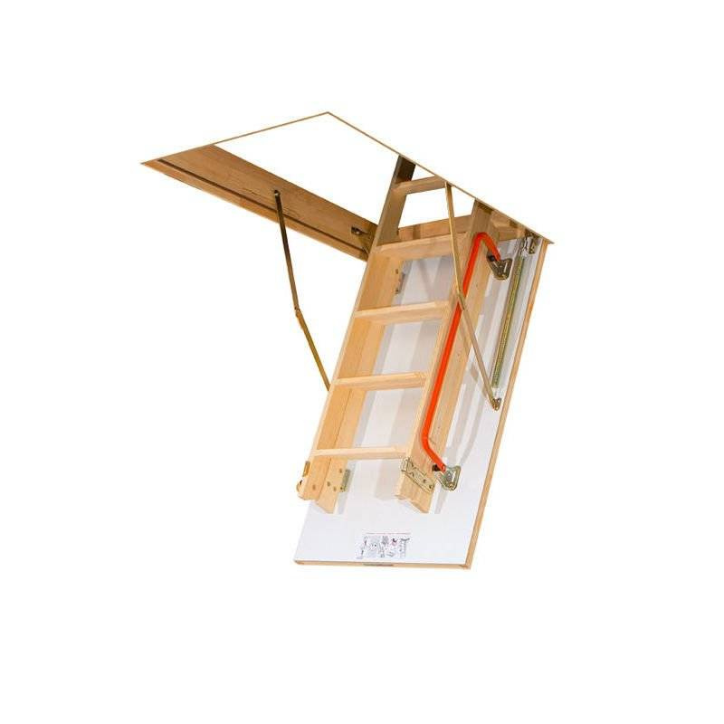 - Stopnie i drabinka wykonane z wysokiej jakości suszonego drewna sosnowego. Stopnie o wymiarach 34 cm x 8 cm posiadają żłobienia antypoślizgowe. Drabinka wykonana jest z drewna klejonego, bez sęków, łączona na "jaskółczy ogon", składa się z jednego wysuwanego segmentu. Opracowany mechanizm pozwala przesuwać dwa segmenty względem siebie. Dłuższy segment zsuwany jest na dół tworząc stabilną drabinkę, przy składaniu schodów jest on przesuwany do góry chowając się na strychu. Segment przesuwny LDS do nabycia osobno.