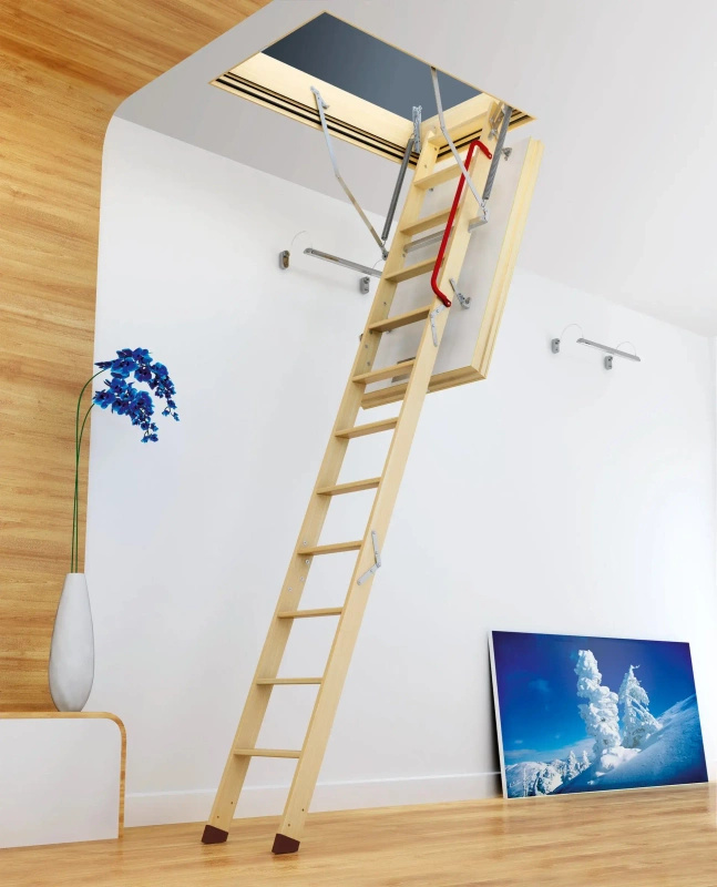 Schody strychowe składane LWT to model schodów 3-segmentowych wykonanych z wysokiej jakości drewna sosnowego. Schody te posiadają znakomite parametry termoizolacyjne, dzięki niskiemu współczynnikowi przenikania ciepła na poziomie 0,51 Uw. Wyposażone są w klapę termoizolacyjną typu sandwich wykończoną białą płytą HDF o grubości 8 cm. Klapa posiada zamek. Stopnie z antypoślizgowym żłobieniem oraz niewielka odległość od ostatniego stopnia do podłogi stanowią dodatkowy komfort podczas ich użytkowania. Schody te posiadają potrójny system uszczelek oraz wygodną poręcz. Dostarczane są kompletnie zmontowane. Nowa konstrukcja schodów (klapa zaczepiana za pomocą specjalnych plastikowych uchwytów, tzw. „klików”) pozwala na ich łatwy i szybki montaż bez konieczności wchodzenia na strych. W zestawie znajdują się także stopki ochronne dostępne tylko w wersji 3-segmentowej i drążek do otwierania klapy.