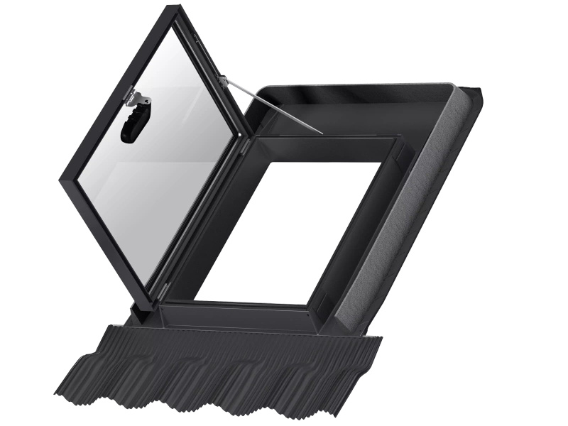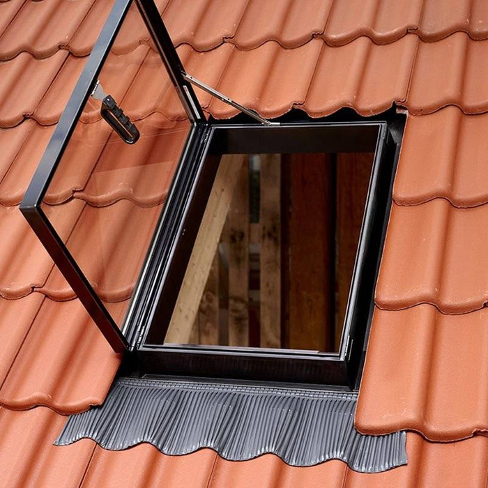 Wyłaz dachowy Velux GVK 0000Z 46X61 posiada uniwersalny i zintegrowany kołnierz uszczelniający dedykowany do zarówno do płaskich jak i profilowanych pokryć dachowych do 6 cm wysokości.